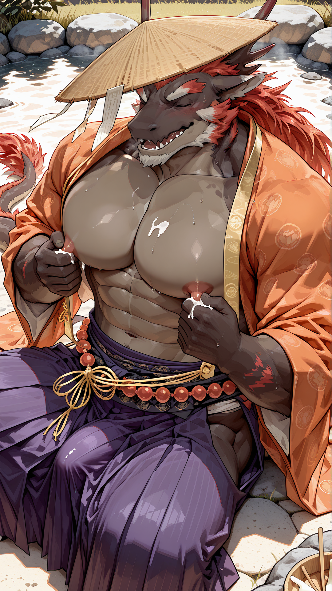 Juzumaru, shirtless, orange haori, purple hakama, golden stole, beads around the waist, decorative cod, waist cloth, tabi