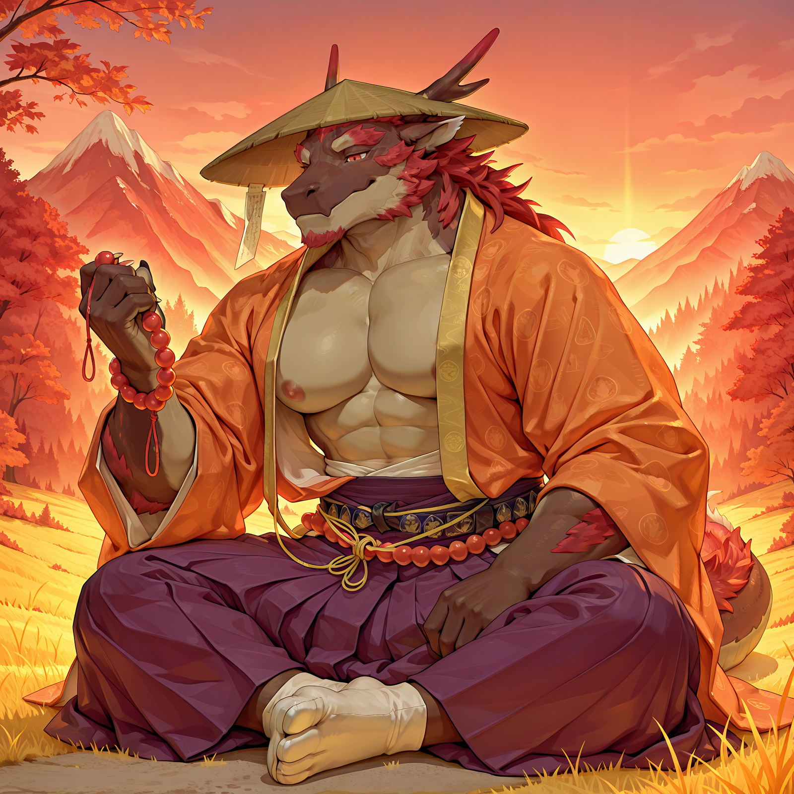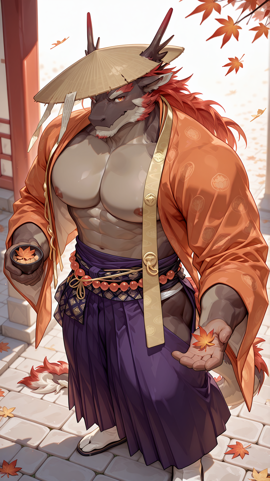 衣装のプロンプト: オレンジ色の羽織、紫の袴、金色の披肩、足袋、藪帽子、腰に巻かれた数珠、腰布