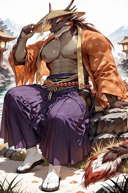 服装提示词:橙色外衣、紫色袴、金色披肩、足袋、草帽、腰间珠串、腰布