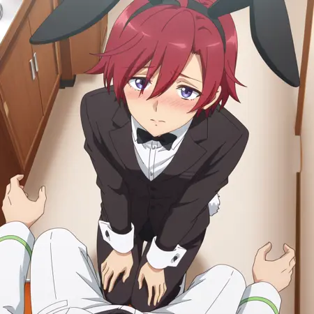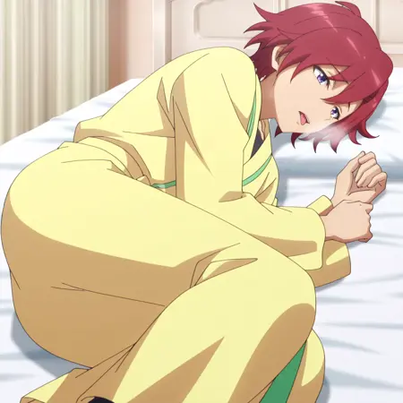 ATNAtsushi、1男の子、赤髪、短髪、紫の目、前髪、髪の間の眉、
