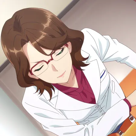 ATNJunko, brown hair, glasses, medium hair, green eyes, bangs, red-framed eyewear, parted bangs,