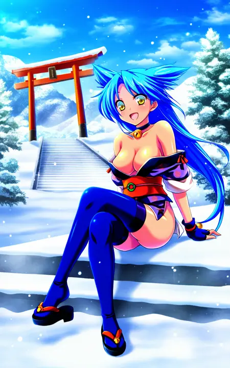 | 학습된 단어 | suzumernc, tan, long hair, blue hair, yellow eyes, medium breasts복사됨! ninninkuno outfit, thighhighs, gloves, cleavage, bare shoulders, japanese clothes, choker, fingerless gloves, kimono, off shoulder, collar, jingle bell, neck bell, short kimono, sandals복사됨! |
