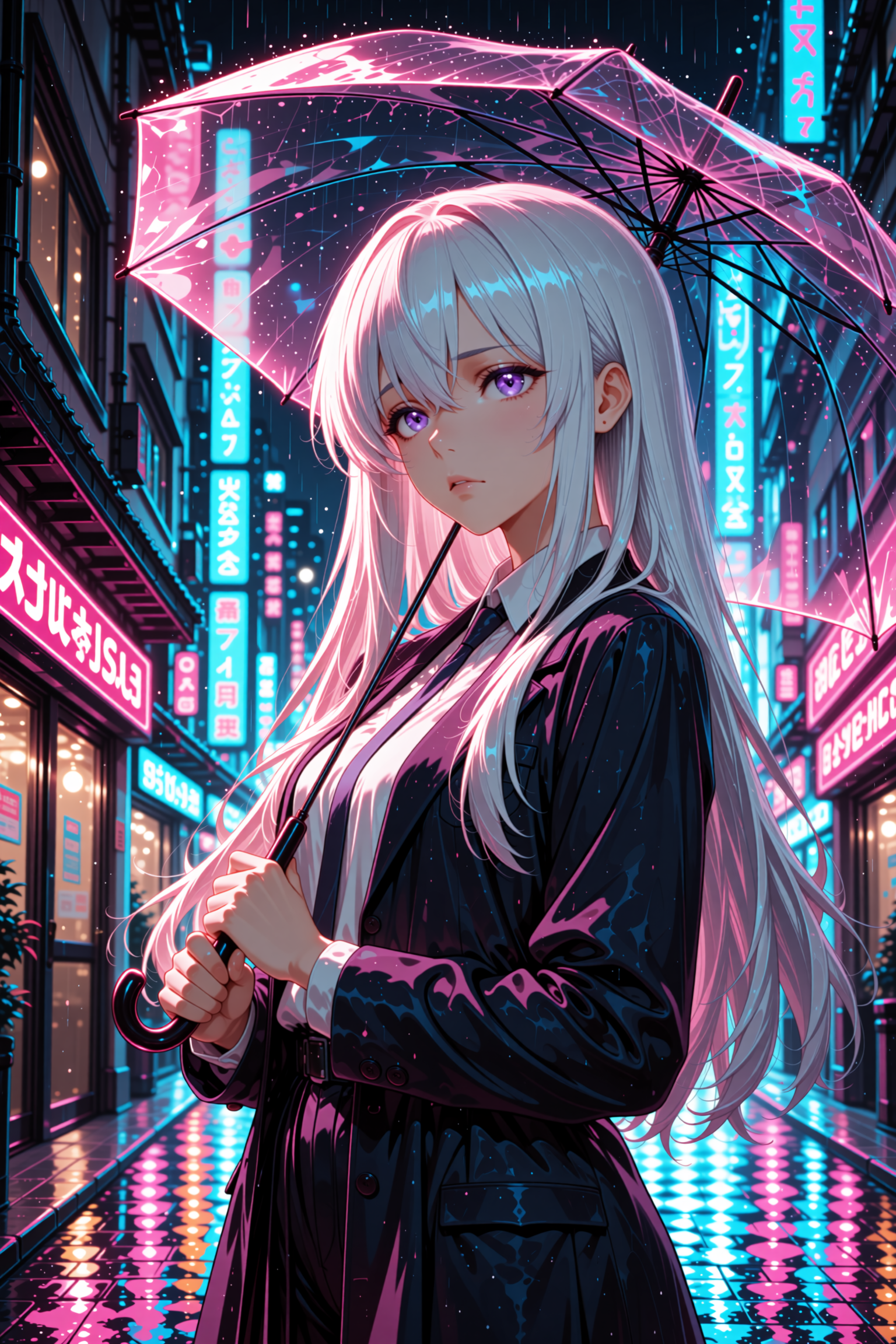 anime, masterpiece, best quality, 1girl, neon hacker, short purple hair with glowing cyan highlights, cybernetic eye augmentation, focused expression, typing on holographic keyboard, glowing UI reflections on face, dark room illuminated by multiple screens, cyberpunk 2077 aesthetic, sharp details, cinematic lighting, rain on window bokeh, DETAILED EYES, tech wear, futuristic