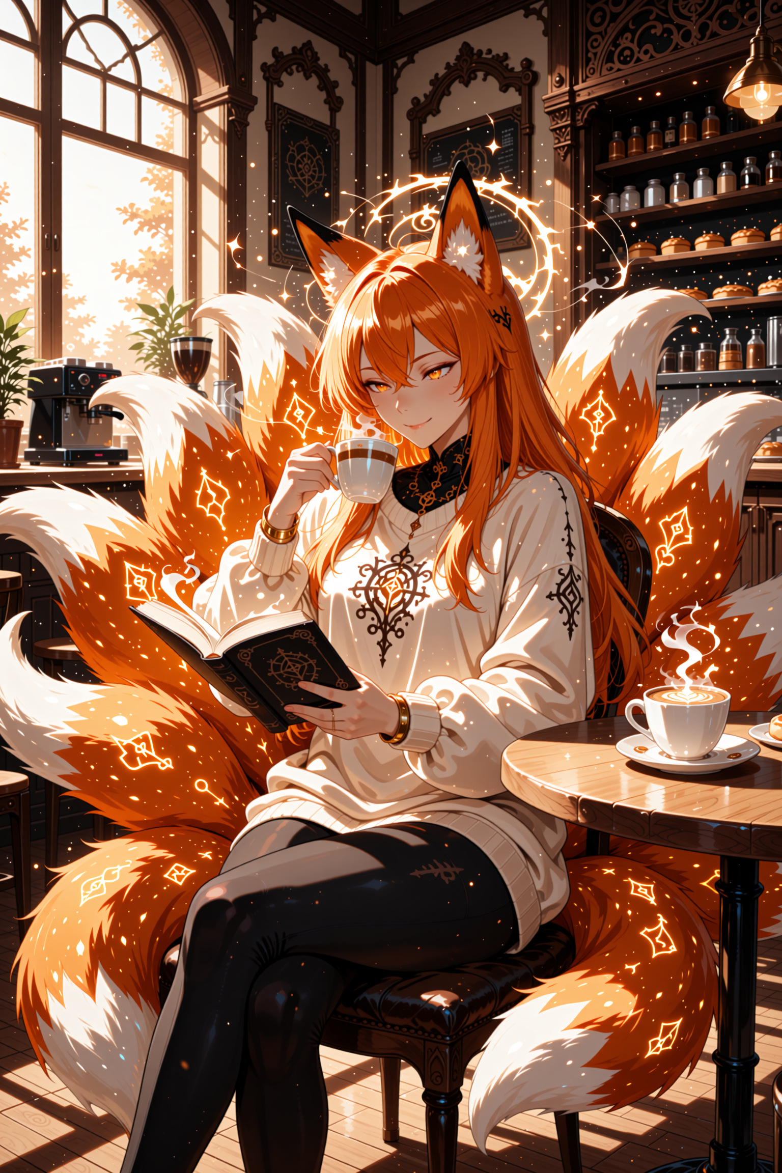 anime, 1girl, nekomimi, fluffy cat ears, long silver hair with bells, golden feline eyes, playful smirk, witch hat with star ornaments, casting fire magic, floating spell circles, cozy library background, warm candlelight, soft shading, fluffy tail visible, DND fantasy style, vibrant colors, DETAILED FUR, sparkles around hands