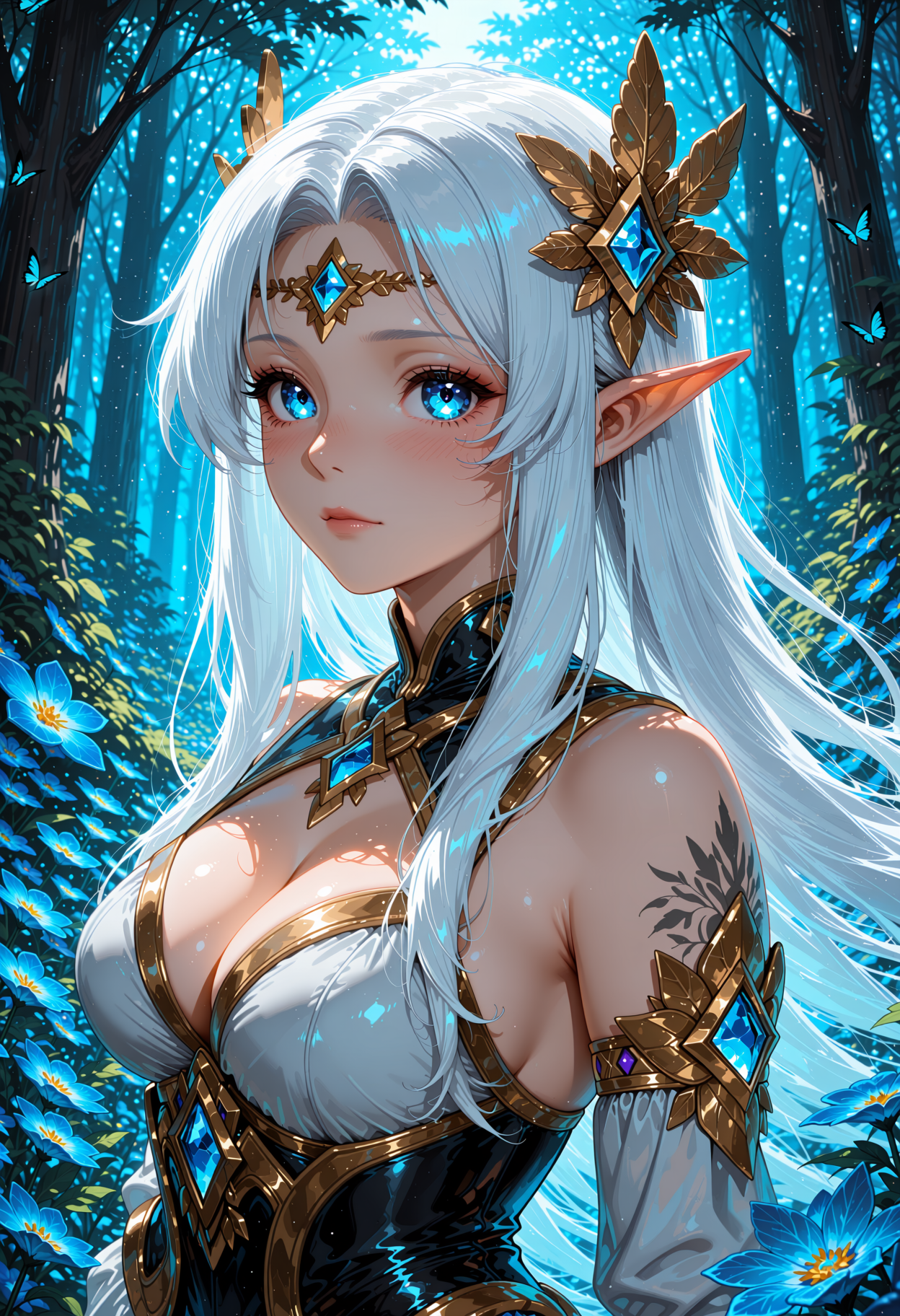 anime, 1girl, elf, long white hair, glowing blue eyes, pointy ears, nature background, ANIME, masterpiece, sharp focus, ethereal glow, MOE STYLE, tree magic, fast render