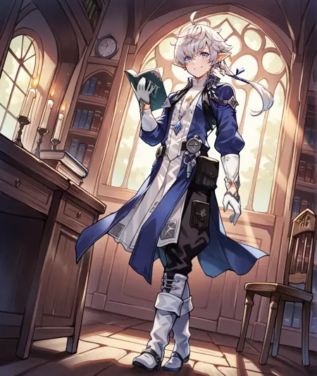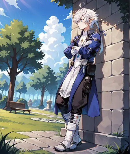 标签:AlphineauBase, 埃利泽, 精灵, 尖耳朵, 银色耳夹, 一只银色耳环, 左耳银色耳环, 蓝眼睛, 白发, 长发, 编辫马尾, 天线发, 蓝色发带, 饰品, 项链, 蓝色外套, 有领外套, 长袖, 白色衬衫, 有领衬衫, 白色手套, 黑色腰包, 黑色长裤, 白色及膝靴,