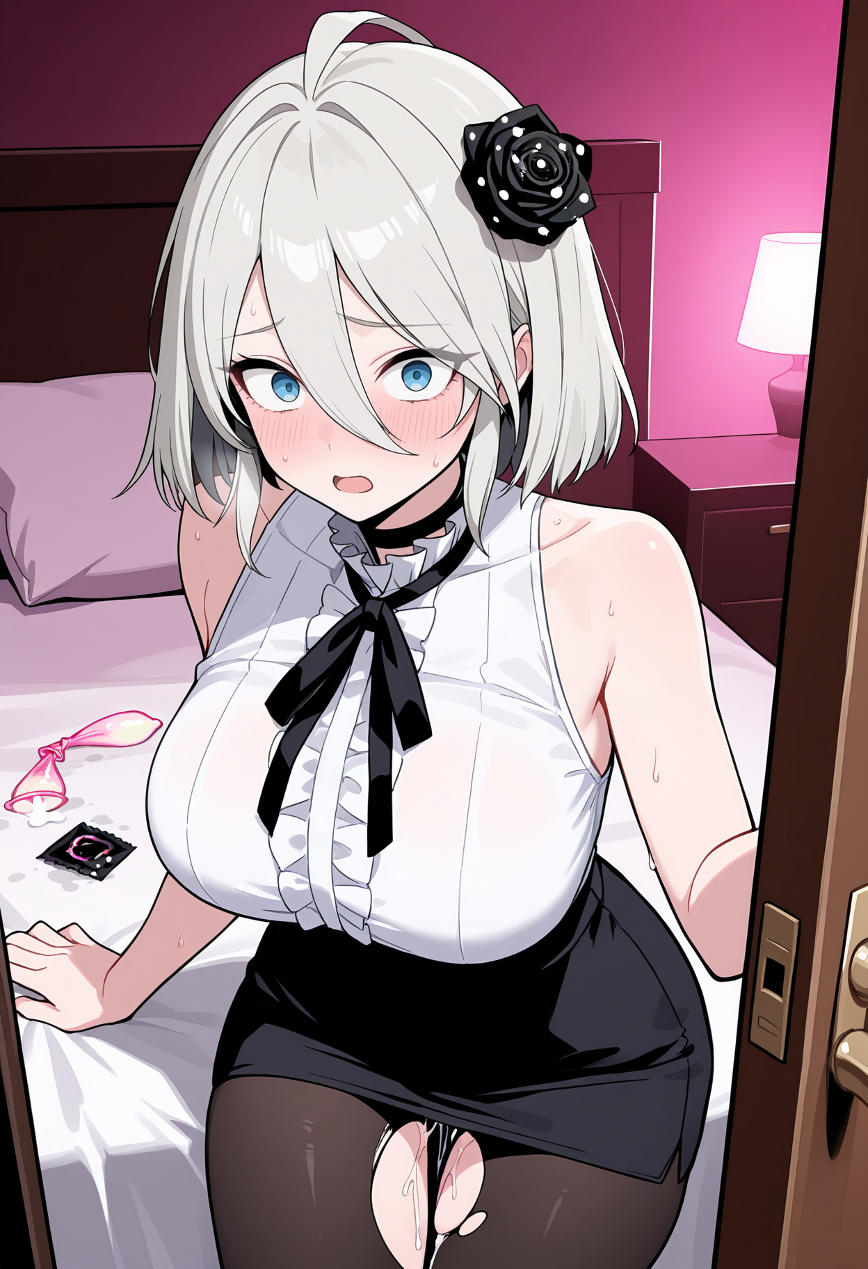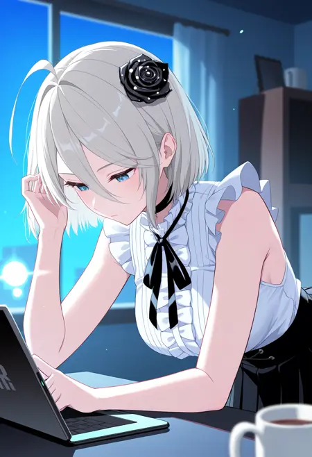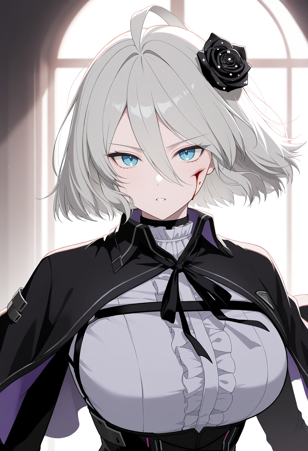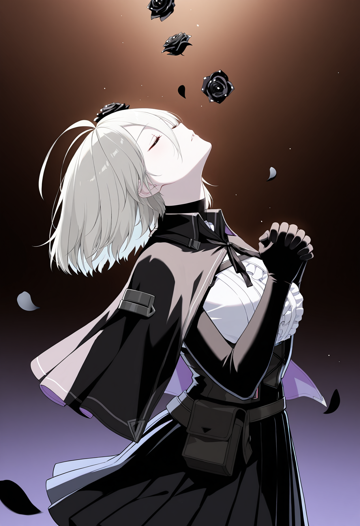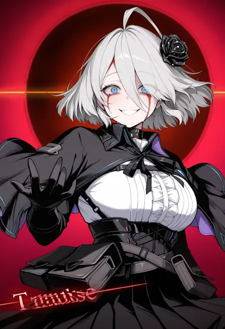 | トレーニングワード | r3n04czn, blue eyes, white hair, short hair, hair between eyes, ahoge, black rose, hair flower, black capelet, black ribbon, neck ribbon, collar, center frills, white shirt, frilled shirt, underbust, chest harness, black sleeves, long sleeves, black gloves, corset, high-waist skirt, black skirt, pleated skirt, black belt, multiple belts, belt pouch, belt buckle, black pantyhose, seamed legwear, thigh strap,コピーしました! |
