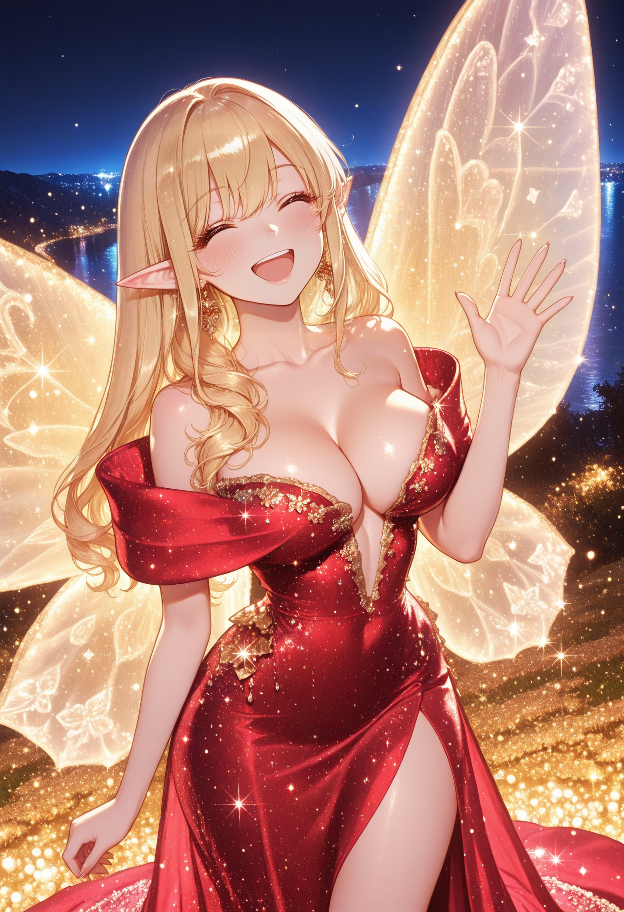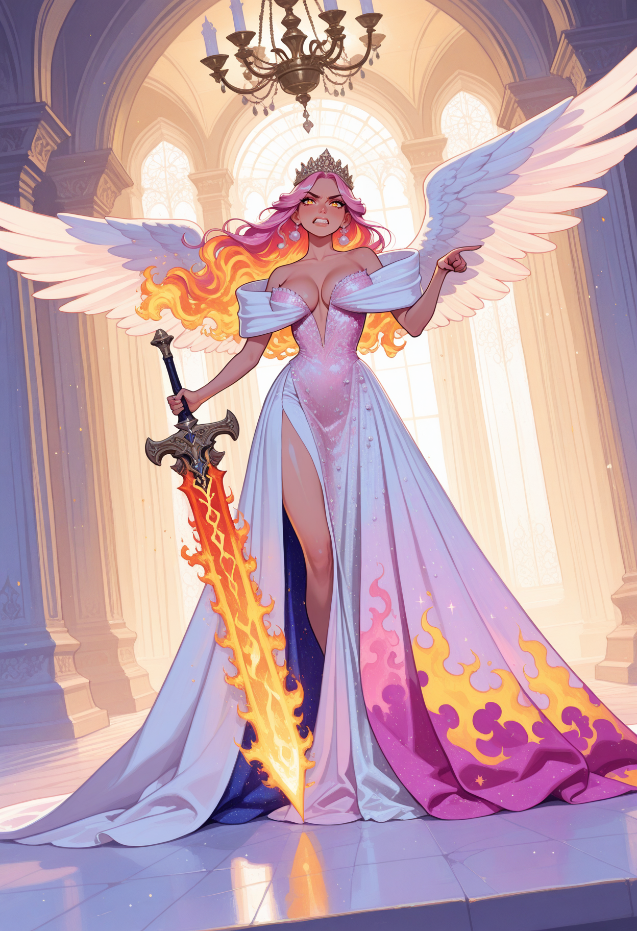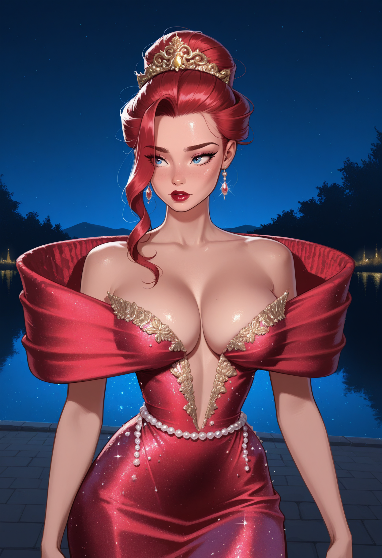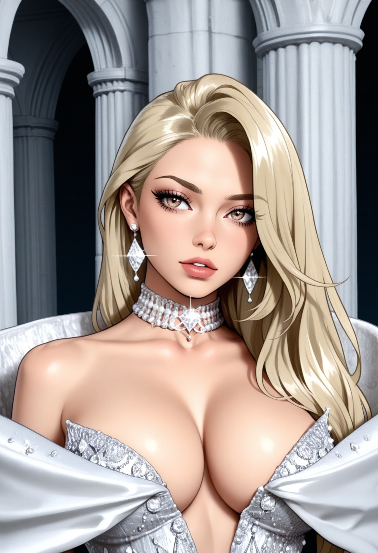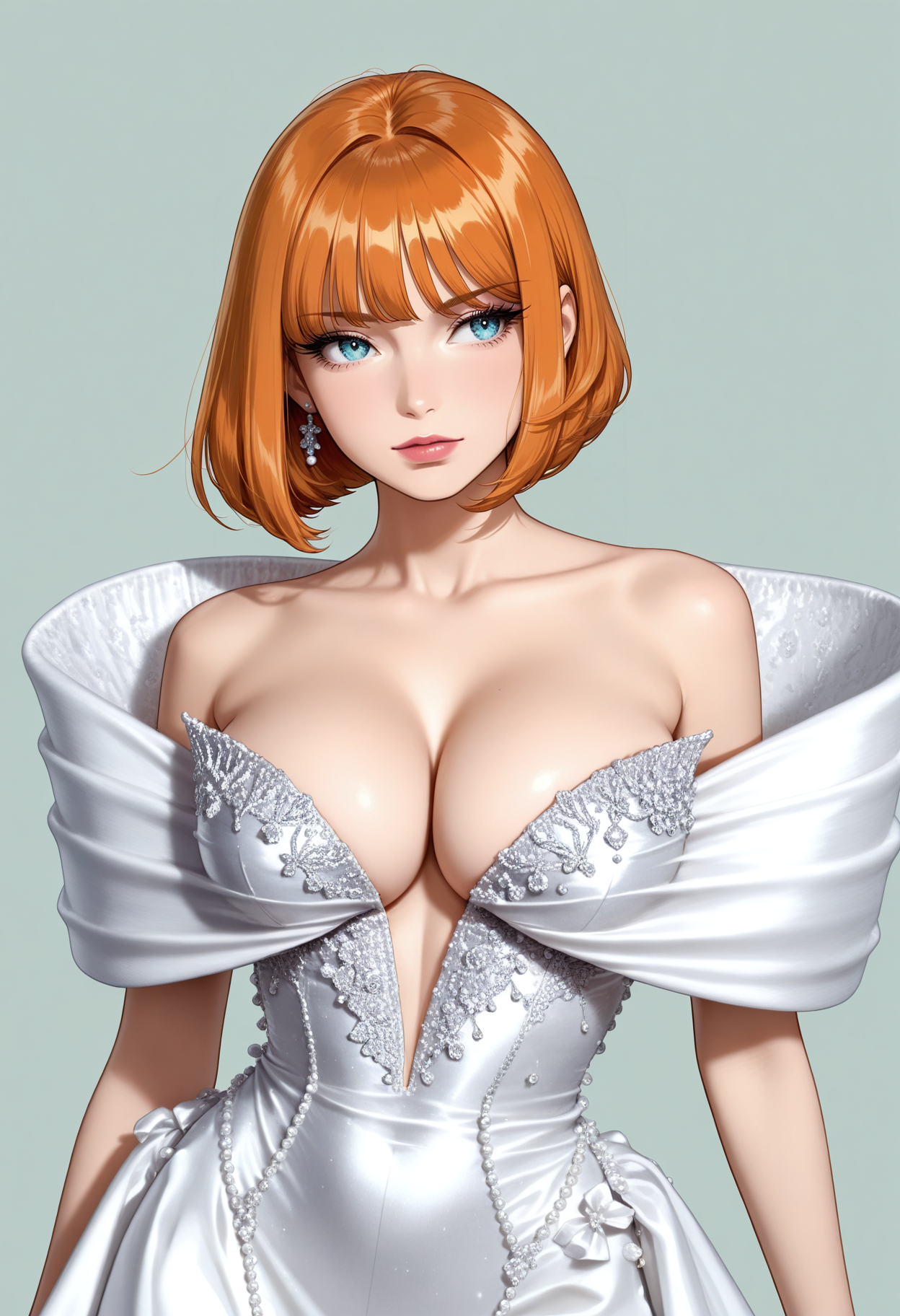 白色连衣裙,缎面,深V领,礼服裙,高级定制,(宽大蓬松的环绕肩部),露肩,珍珠刺绣