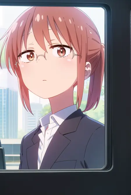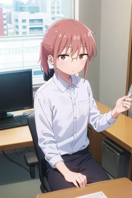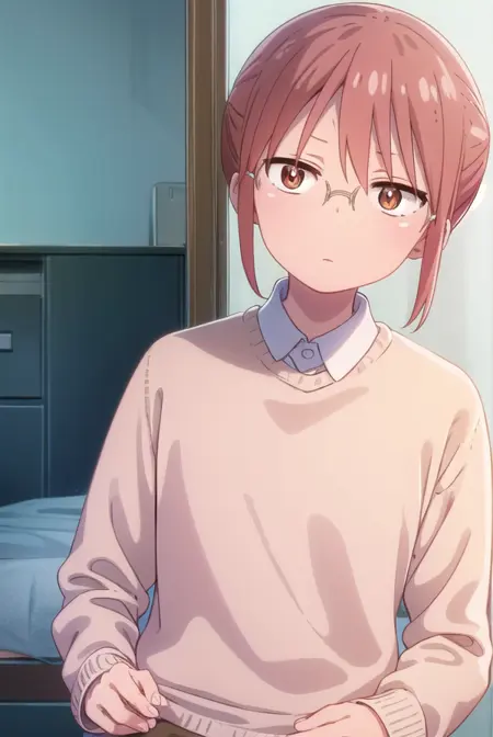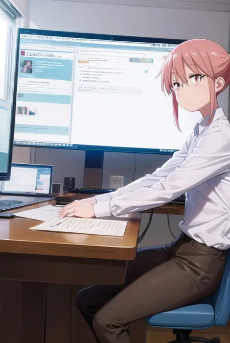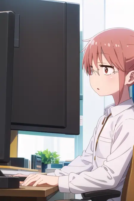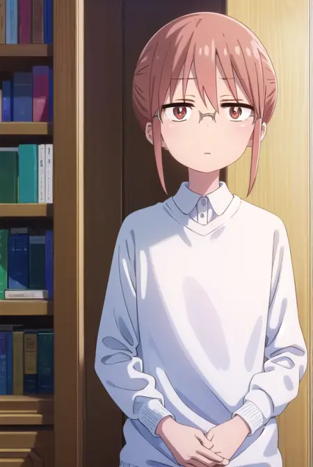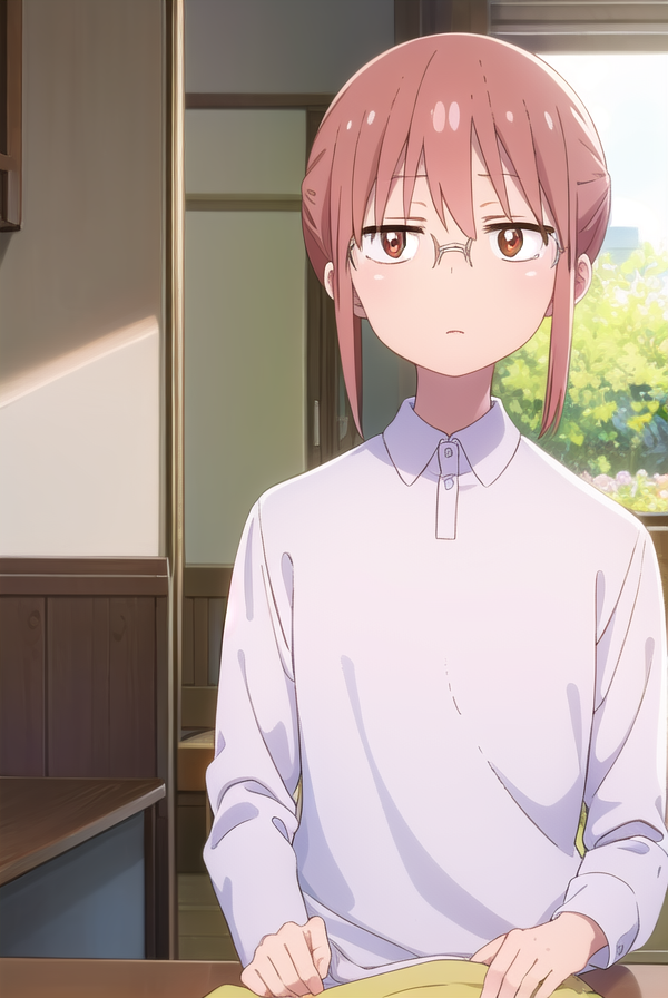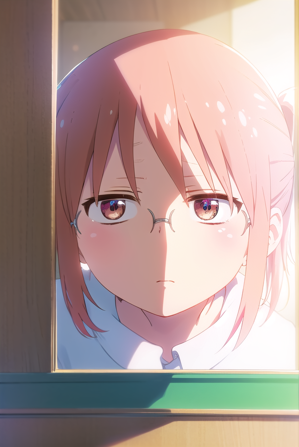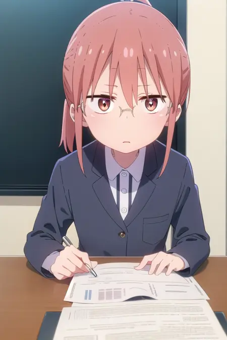 kobayashi、ポニーテール、ピンクの髪、メガネ、短い髪、(茶色の目:1.5)