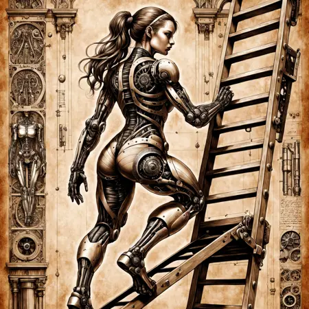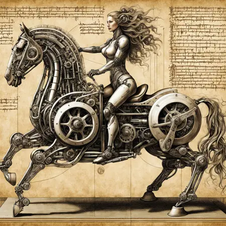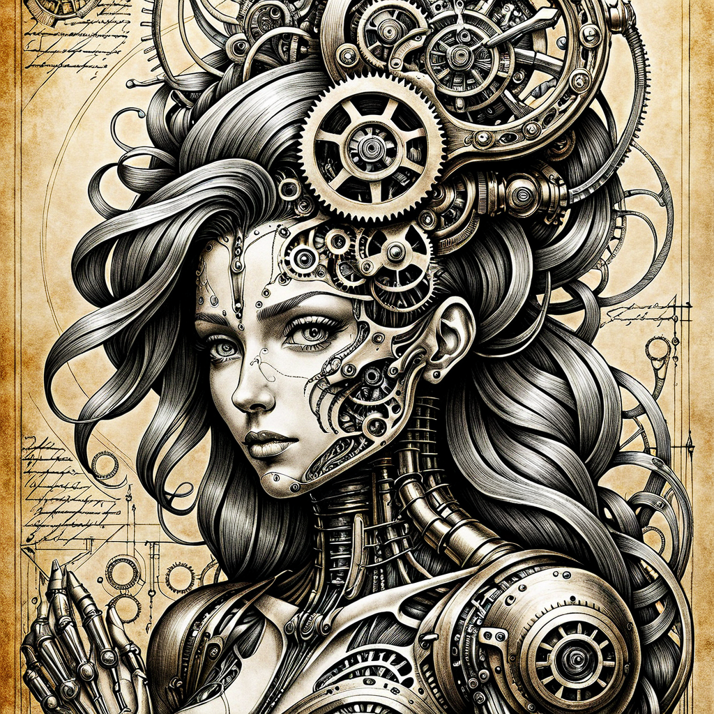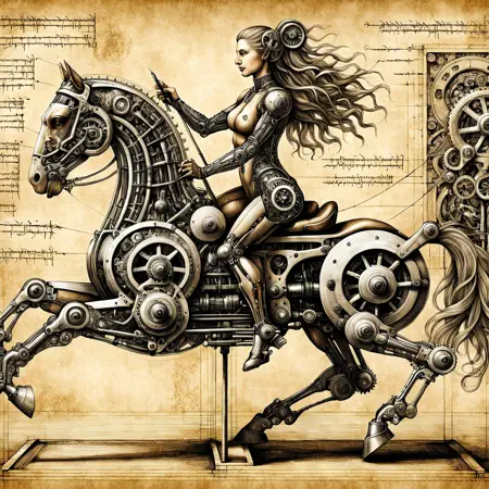 由于我使用的是 ComfyUI,提示词并未直接显示,但你可以将其加载到 ComfyUI 中查看提示词。它们非常简单,例如:“Biomech girl riding a horse, by Da_Vinci, ink, sepia, 8k, masterpiece, extremely detailed.” 如果你读到这里,恭喜你!希望你喜欢。