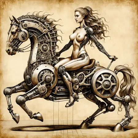 ComfyUI를 사용했기 때문에 프롬프트가 표시되지 않지만, Comfy에서 로드하면 프롬프트를 확인할 수 있습니다. 프롬프트는 매우 간단합니다. 예: "Biomech girl riding a horse, by Da_Vinci, ink, sepia, 8k, masterpiece, extremely detailed." 여기까지 읽어주셔서 감사합니다. 즐겁게 사용하시길 바랍니다!