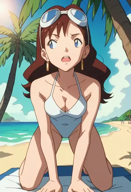 PMGC5, 갈색 머리카락, 긴 머리, 파란색 눈, 금색 귀걸이, 머리에 안경, 흰색 레오타드, 가슴 선,