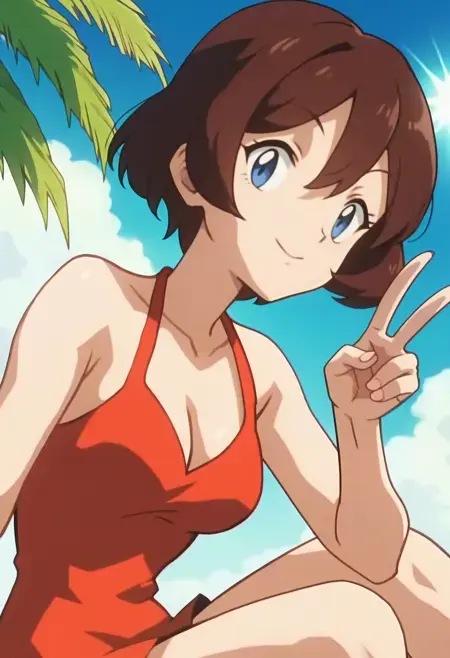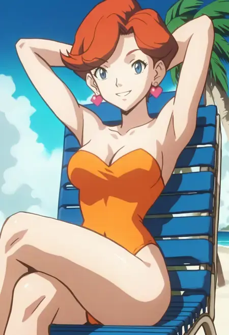 PMGC4, 주황색 머리카락, 단발, 뒤로 젖힌 앞머리, 파란색 눈, 빨간색 귀걸이, 원피스 수영복, 가슴 선, 어깨가 드러난, 주황색 레오타드,