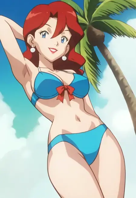PMGC2, 빨간색 머리카락, 눈 사이의 머리카락, 파란색 눈, 흰색 귀걸이, 립스틱, 연한 파란색 비키니, 빨간 리본, 배꼽,