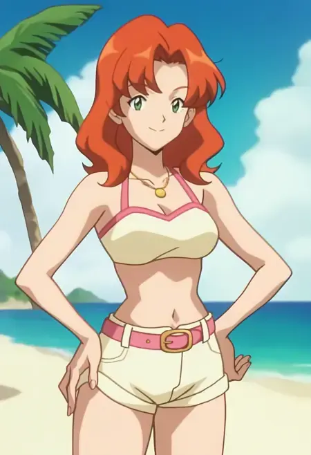 PMGC1, 주황색 머리카락, 앞머리, 중간 길이 머리, 녹색 눈, 성숙한 외모, 금색 목걸이, 크롭탑, 배꼽, 복부, 분홍색 벨트, 반바지,