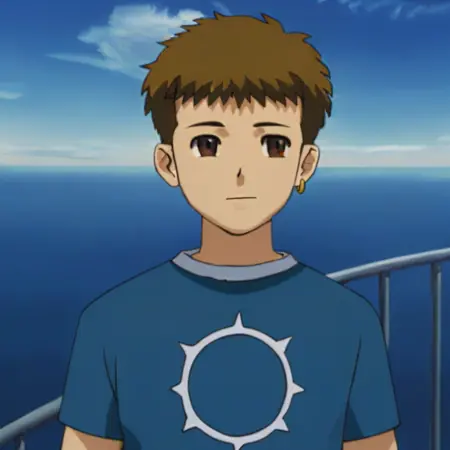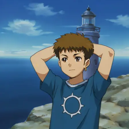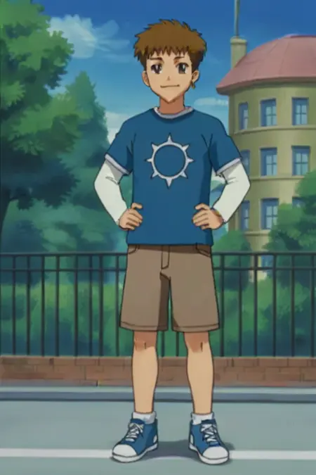 프롬프트: 남성, 갈색 머리카락, 갈색 눈, 한쪽 귀걸이, 보석, 파란 티셔츠, 프린트 셔츠, 갈색 반바지, 파란 스니커즈, 실내(경기장/컨트롤 패널/대형 화면/관중), 야외(절벽/하늘/구름/나무/등대/난간/바다/지평선), 야외(주거지/푸른 하늘/집/도로/보도/울타리/녹지/등불)