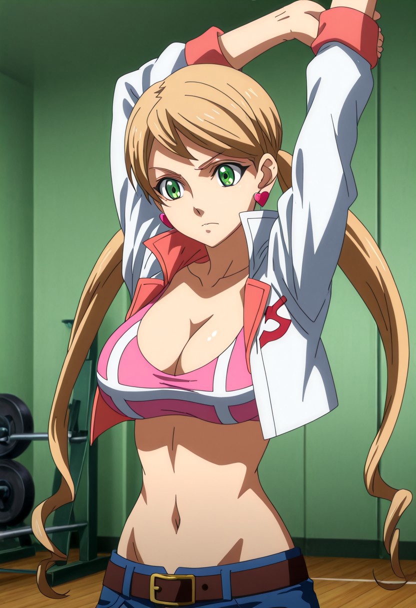 blonde hair, long hair, twin tails, green eyes, heart earrings,