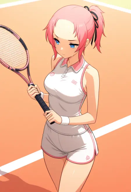 cerisediez, pink hair, short hair, forehead, blue eyes, hair ribbon, ponytail,