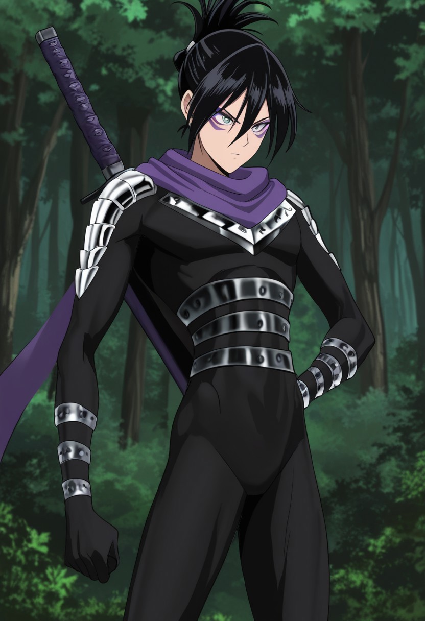 Speed O Sound Sonic, black hair, folded ponytail, gray eyes, purple facial marks, black bodysuit, long purple scarf, metal accents, purple katana on back