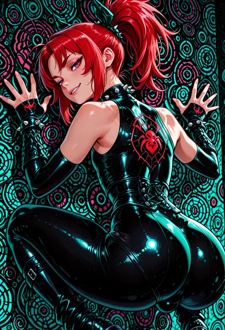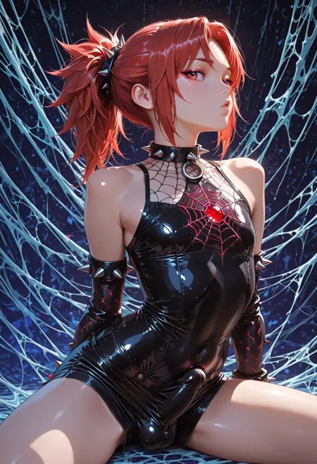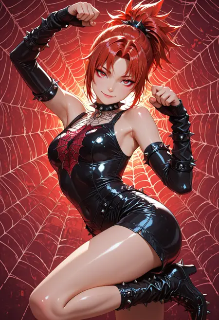 거미 스타일 (여성): hires, masterpiece, best quality, amazing quality, very aesthetic, absurdres, realistic, anime style, Shuwen, 1girl, breasts, solo, red eyes, red eyeliner, ponytail, spiked hair, long hair, shiny spike hairtie, collared leather tabard, spider choker, bare shoulders, arm warmers, pleated skirt, skin tight, dancing, looking at viewer, floating hair, abstract background, spider web pattern, sidelighting,