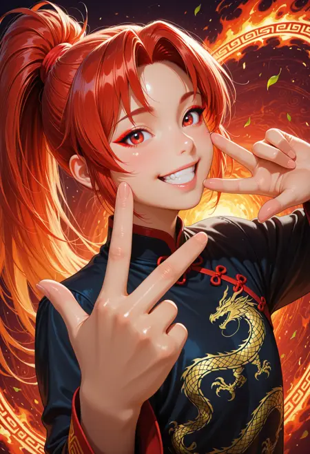 무술가 (여성): realistic anime textures, hires, masterpiece, best quality, amazing quality, very aesthetic, absurdres, Shuwen, 1girl, breasts, solo, red eyes, red eyeliner, red hair, ponytail, spiked hair, medium hair, hairbow, dragon theme, black clothes, waist armor, chinese armor, mandarin collar, bare shoulders, arm warmers, skin tight, abstract background, dragon pattern, coyboy shot, fighting stance, sidelighting,