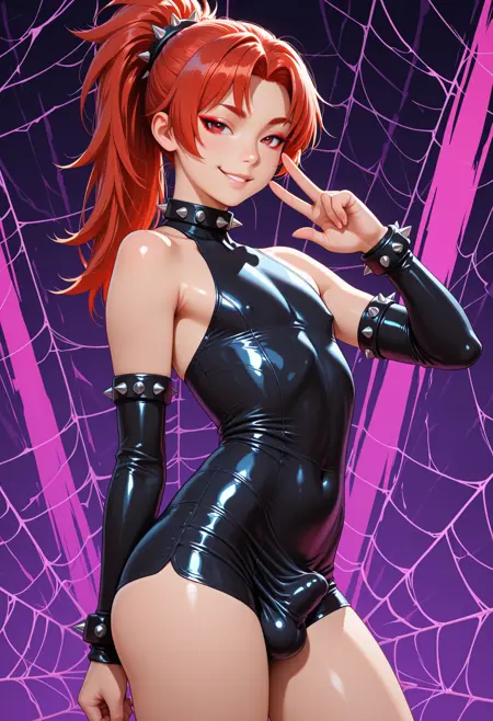 거미 스타일 (남성): hires, masterpiece, best quality, amazing quality, very aesthetic, absurdres, realistic, anime style, Shuwen, otoko no ko, 1boy, solo, red eyes, red eyeliner, ponytail, spiked hair, long hair, shiny spike hairtie, collared leather tabard, spider choker, bare shoulders, arm warmers, pleated skirt, skin tight, dancing, looking at viewer, floating hair, abstract background, spider web pattern, sidelighting,