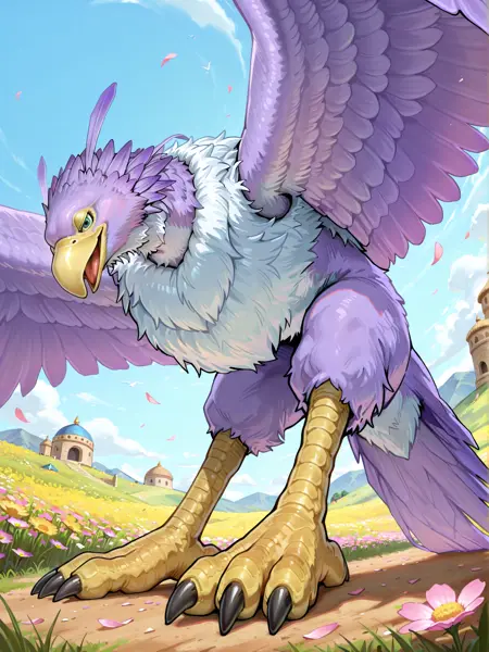 empyreail, empyrea_purple, light purple body, black eyes, green pupils, yellow beak, white neck tuft, white chest tuft, light purple stomach, light purple thighs, yellow avian legs, light purple wings,엠프레아 (주황색)