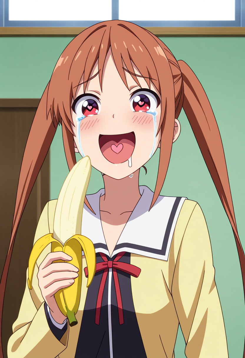 yoshikoww, red eyes, brown hair, long hair, very long hair, twintails, sidelocks,