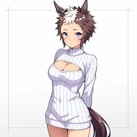 - トリガー:Mejiro, 1girl, animal ears, horse girl, white gloves, horse tail, navel, black shorts, green necktie, short hair, multicolored hair, brown hair, white footwear, medium breasts, midriff, striped jacket, blue eyes, vertical-striped shirt, vertical stripes, two-tone hair, white hair, short shorts, long sleeves, white jacket, open clothes, belt, open jacket