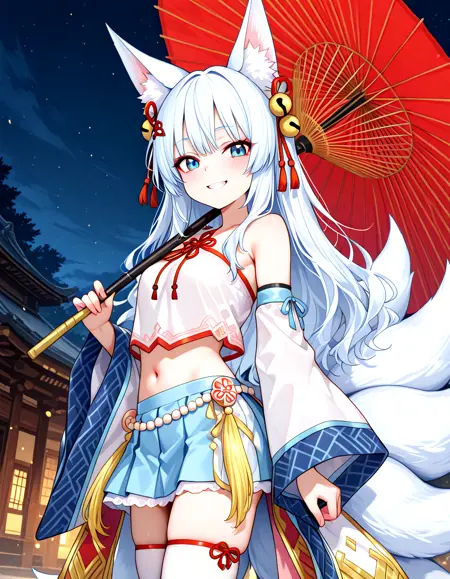 kuuki_shoujo_air_nine_tail_fox, kitsune, fox girl, kyuubi, animal ears, fox ears, animal ear fluff, fox tail, multiple tails, long hair, white hair