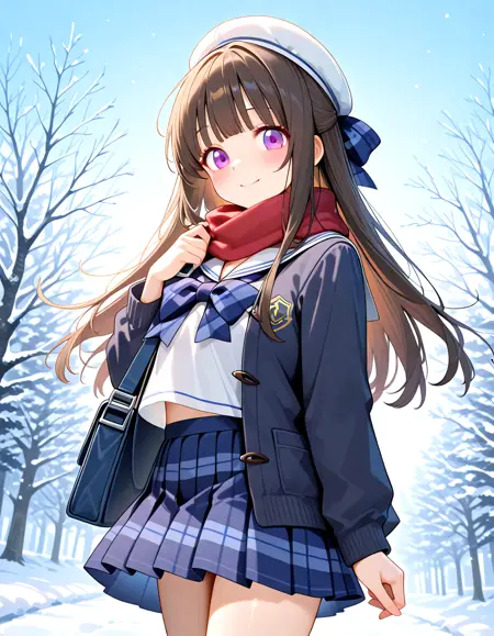 견골, 복부 노출, 다리 노출, 학교 유니폼, 세라후쿠, 주름치마, 체크무늬 치마, 파란 치마, 흰 셔츠, 단소매, 흰 해군 목걸이, 체크무늬 리본, 체크무늬 넥타이, 체크무늬 리본, 파란 넥타이, 파란 리본, 리본, 베레모, 흰 머리장식