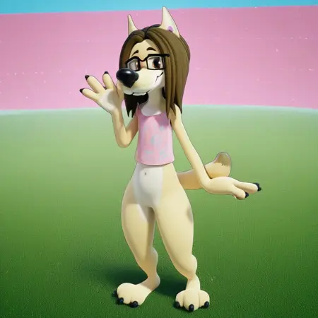 canine, coyote, tan fur, brown hair, medium hair, brown eyes, black nose, dog tail, glasses, pink top, bottomless, black claws,