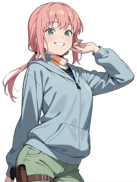 服装(暂定) ・围巾,蓝色连帽衫,帽子下垂,长袖,绿色长裤,大腿枪套,枪套,