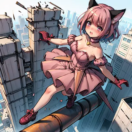 私は、安全線なしで、都市の風景の上空をローラが工業用パイプを渡るシーンを作成しました。