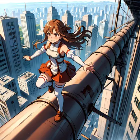 我创建了一个场景:洛拉在没有安全绳的情况下,跨越高耸于城市景观之上的工业管道。