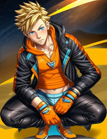 1boy, spark \(pokemon\), spark(pokemon), necklace, blue eyes, blonde hair, blue eyes, gloves, jacket, black jacket, orange gloves, orange sleeveless hoodie, spark(pokemon)_Uniform,