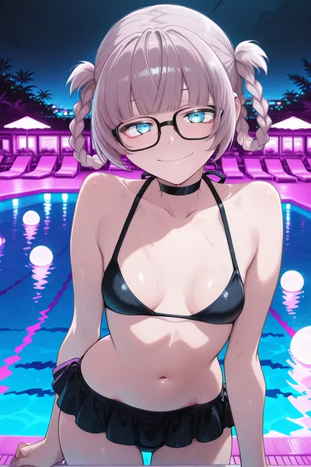3. 游泳池边泳装nazunanan, 1girl, swimsuit, nazunanan bikini, blue eyes, solo, breasts, glasses, pool, night, small breasts, smile, nazunanan bikini, navel, looking at viewer, choker, black-framed eyewear, outdoors