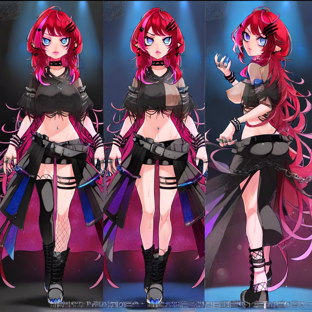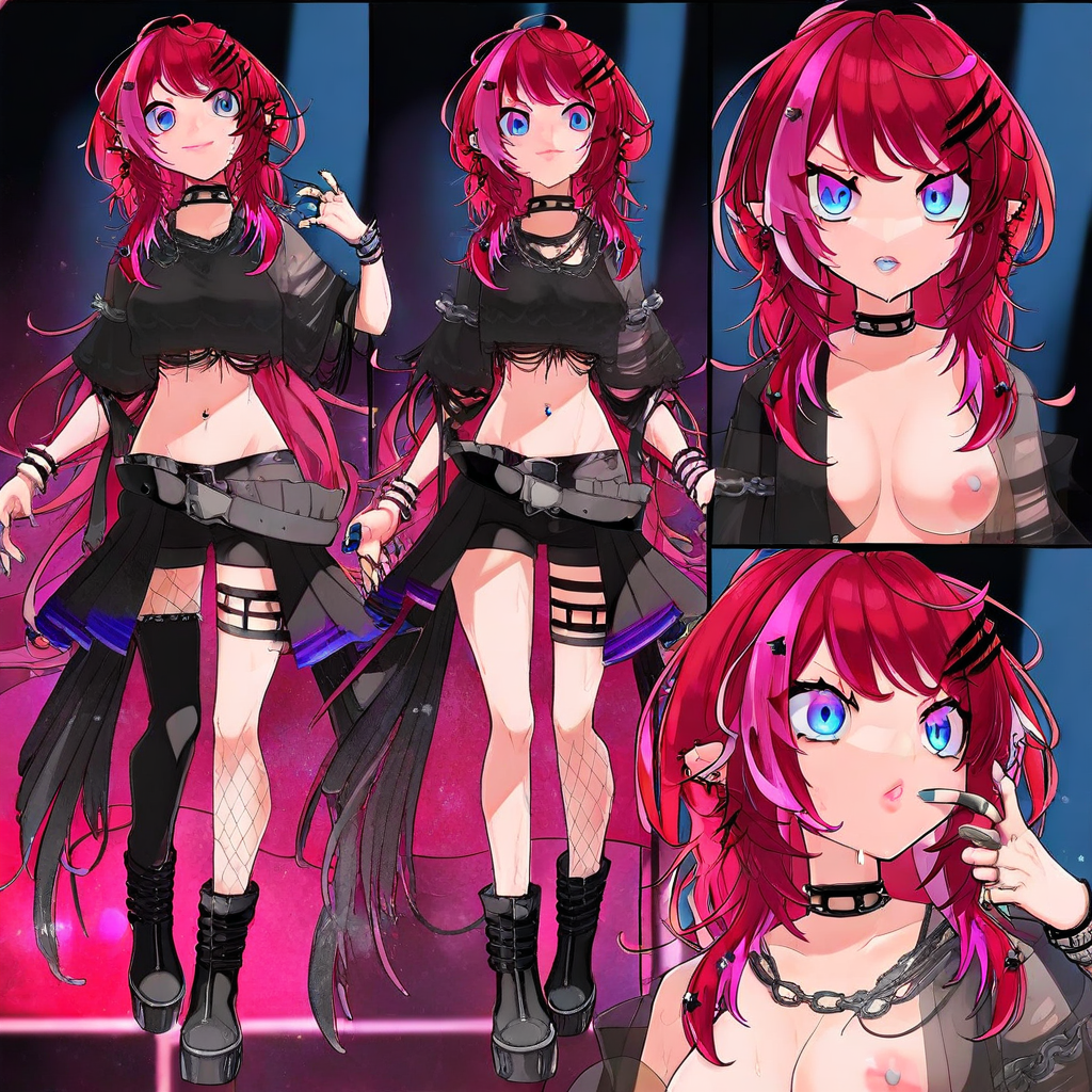 (VTuber_Soraduki, 長い髪, 多色の髪, ピンクの髪, 赤い髪, 尖った耳, 青い目, 髪飾り, 青い爪, ジュエリー, ピアス, チェーン, パーシング, リング, スパイク, チョーカー, シャツ, クロップトップ, おへそ, ショートパンツ, ベルト, 片方の太ももハイ, フィッシュネット, ブーツ),