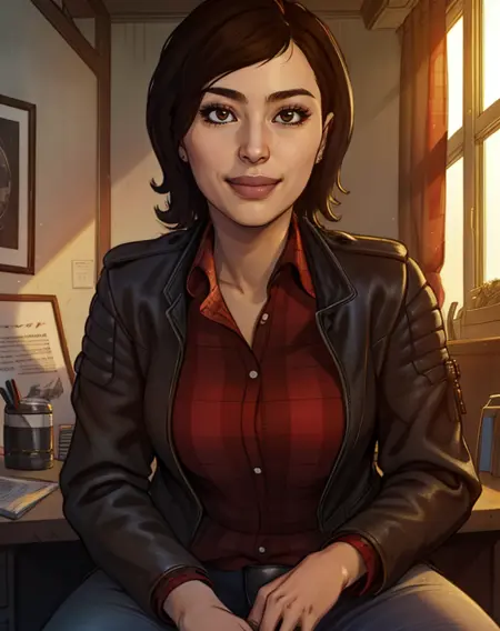 赤いフランシャーシャツ、レザージャケット、ジーンズ、バッジなど