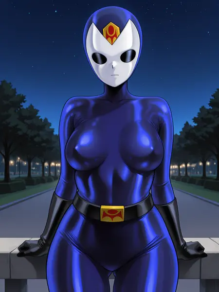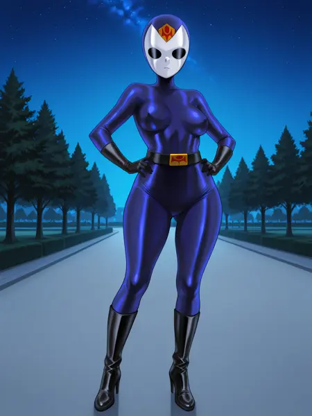 zofa soldier, [navy blue/black] bodysuit, lxmask, [navy blue/black] lxmask, foreheadjewel, chestjewel, black gloves, black belt, buckle, wmask, white wmask, closed mouth, knee boots, high heel boots, black footwear
