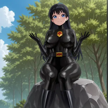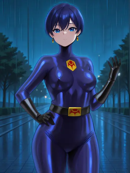 zofa soldier, [navy blue/black] bodysuit, lxmask, [navy blue/black] lxmask, foreheadjewel, chestjewel, black gloves, black belt, buckle, red eyes, empty eyes, looking at viewer, colored skin, [blue skin/grey skin], visible expression, knee boots, high heel boots, black footwear