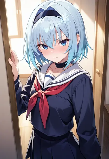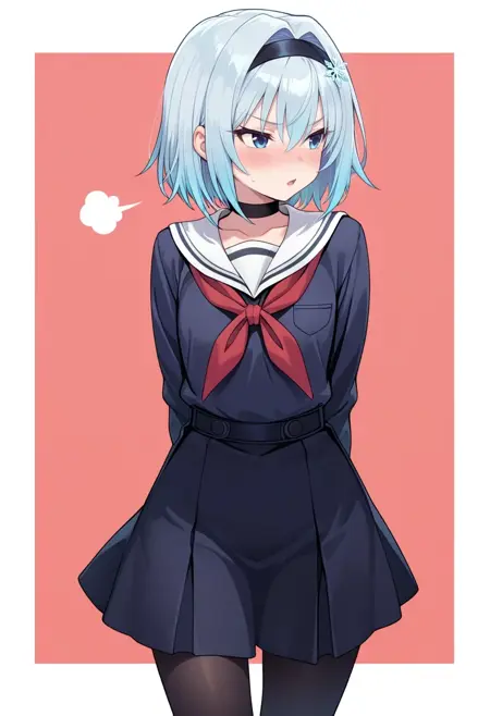 ヘアバンド、白いセーラー襟、黒いシャツ、赤いネッカチーフ、雪の結晶の髪飾り、黒いパンティーストッキング、