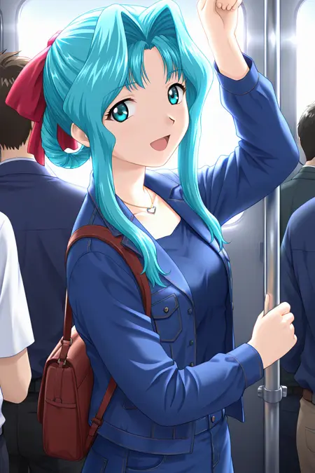 aqua eyes, eyelashes, aqua hair, very long hair, hair down, parted bangs, hair intakes, sidelocks, wavy hair, half updo, shiny hair, hair bow, blue bow, petite,