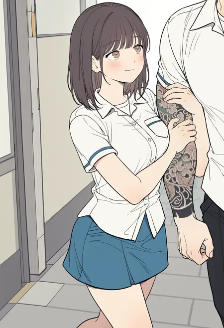 school uniform, white shirt, untucked shirt, short sleeves, breast pocket, blue skirt,