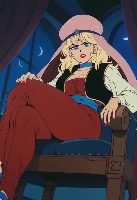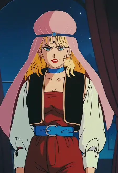 DBExtraGirl05HaskyALT, 금발 머리, 긴 머리, 파란 눈, 이마 문양, 립스틱, 빨간 손톱, 가슴, 베일, 분홍색 머리 장식, 파란 목걸이, 검은 조끼, 열린 조끼, 빨간 점프수트, 가슴 노출, 볼륨감 있는 긴 소매, 흰색 소매, 파란 허리띠, 보라색 샌들,