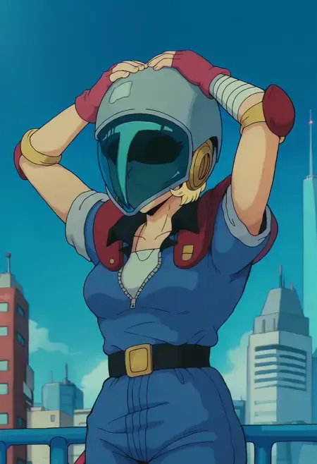 DBExtraGirl05HaskyDEF, 회색 헬멧, 눈 없음, 금발 머리, 파란 점프수트, 어깨 갑옷, 분홍색 손가락 없는 장갑, 붕대 감긴 팔, 비대칭 하의, 한쪽 다리만 덮는 바지, 빨간 부츠,