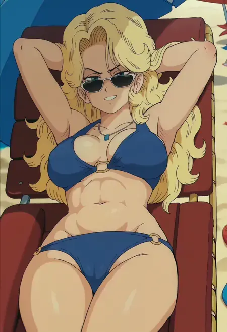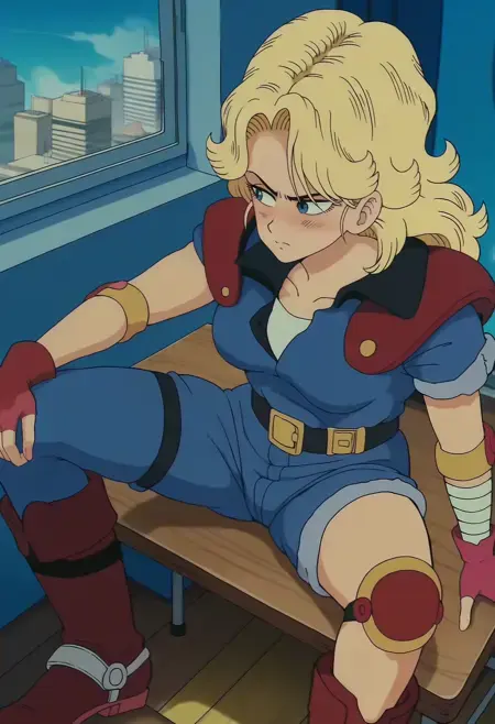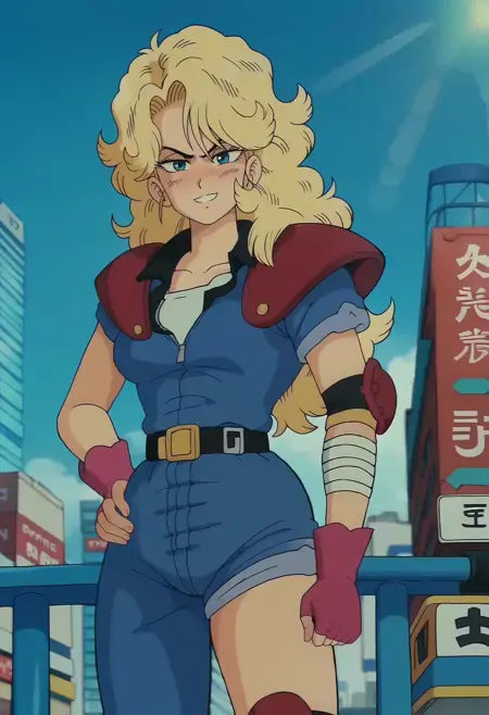 DBExtraGirl05HaskyDEF, 금발 머리, 긴 머리, 파란 눈, 가슴, 파란 점프수트, 어깨 갑옷, 분홍색 손가락 없는 장갑, 붕대 감긴 팔, 비대칭 하의, 한쪽 다리만 덮는 바지, 빨간 부츠,