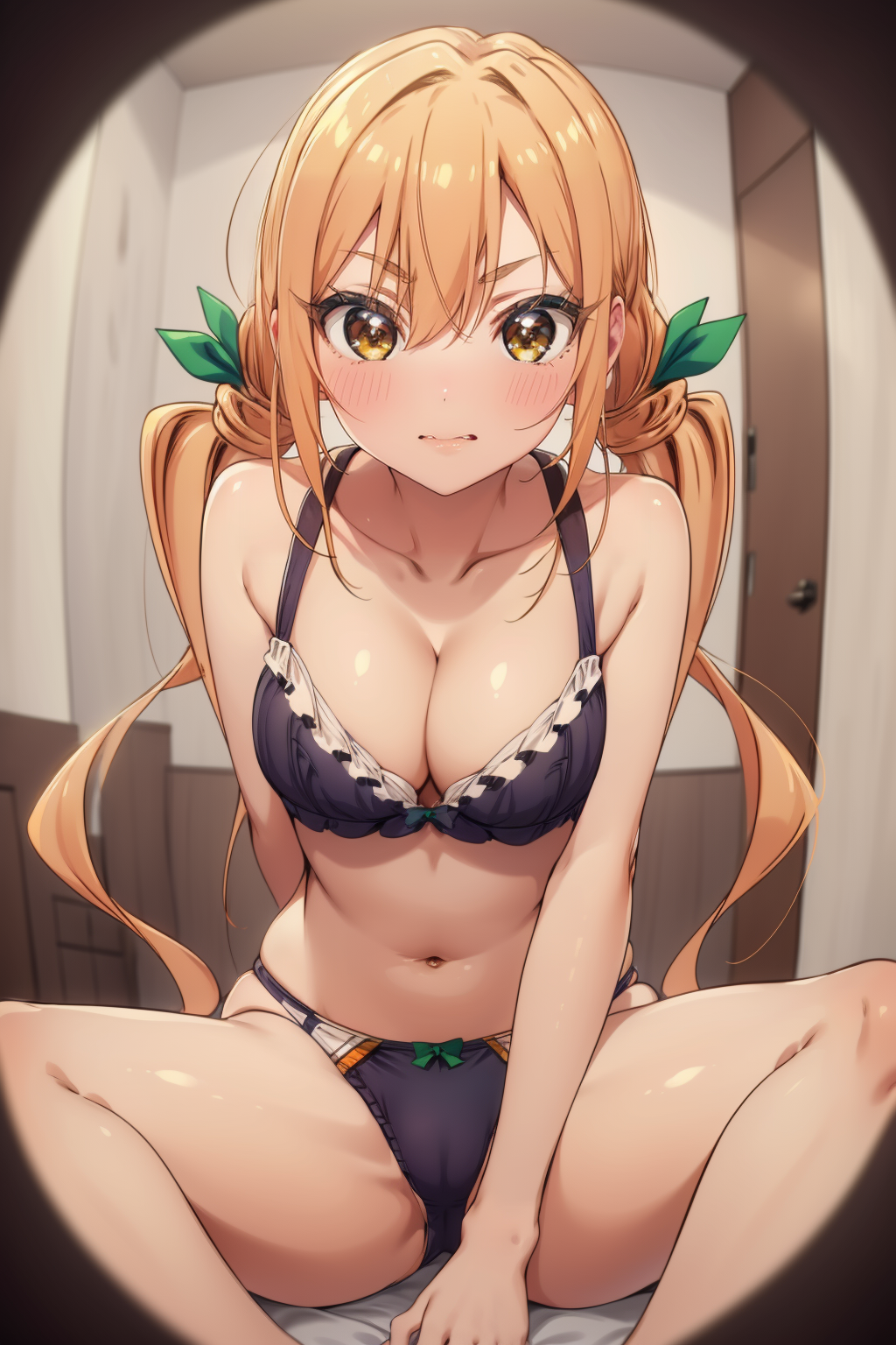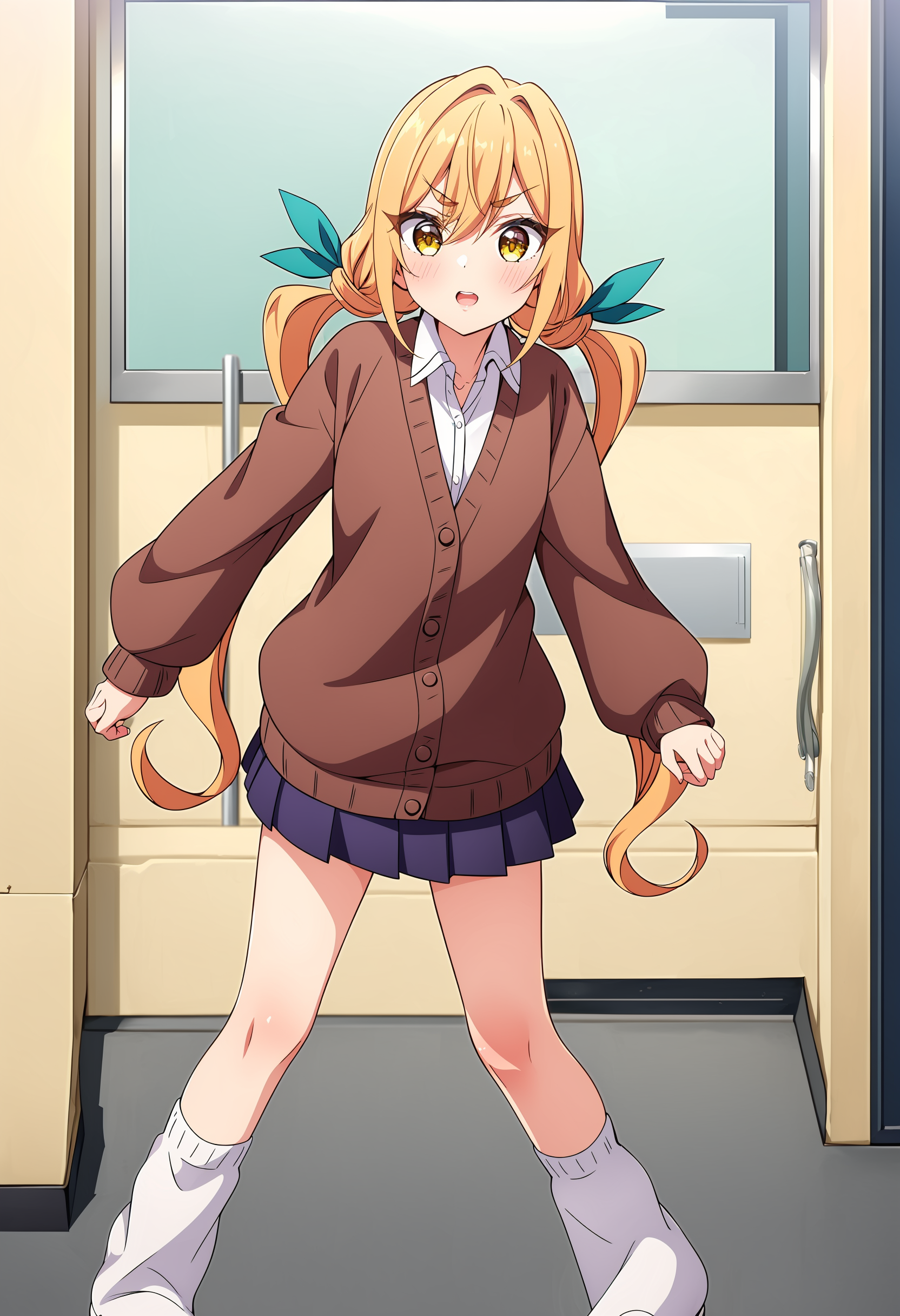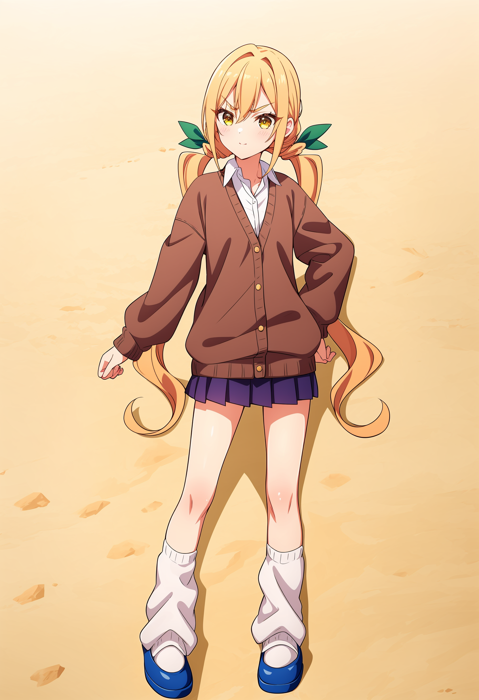 KaraneInda,1girl,solo,low twintails,long hair,blonde hair,orange hair,bangs,green hair bow ribbon,hair between eyes,yellow eyes,