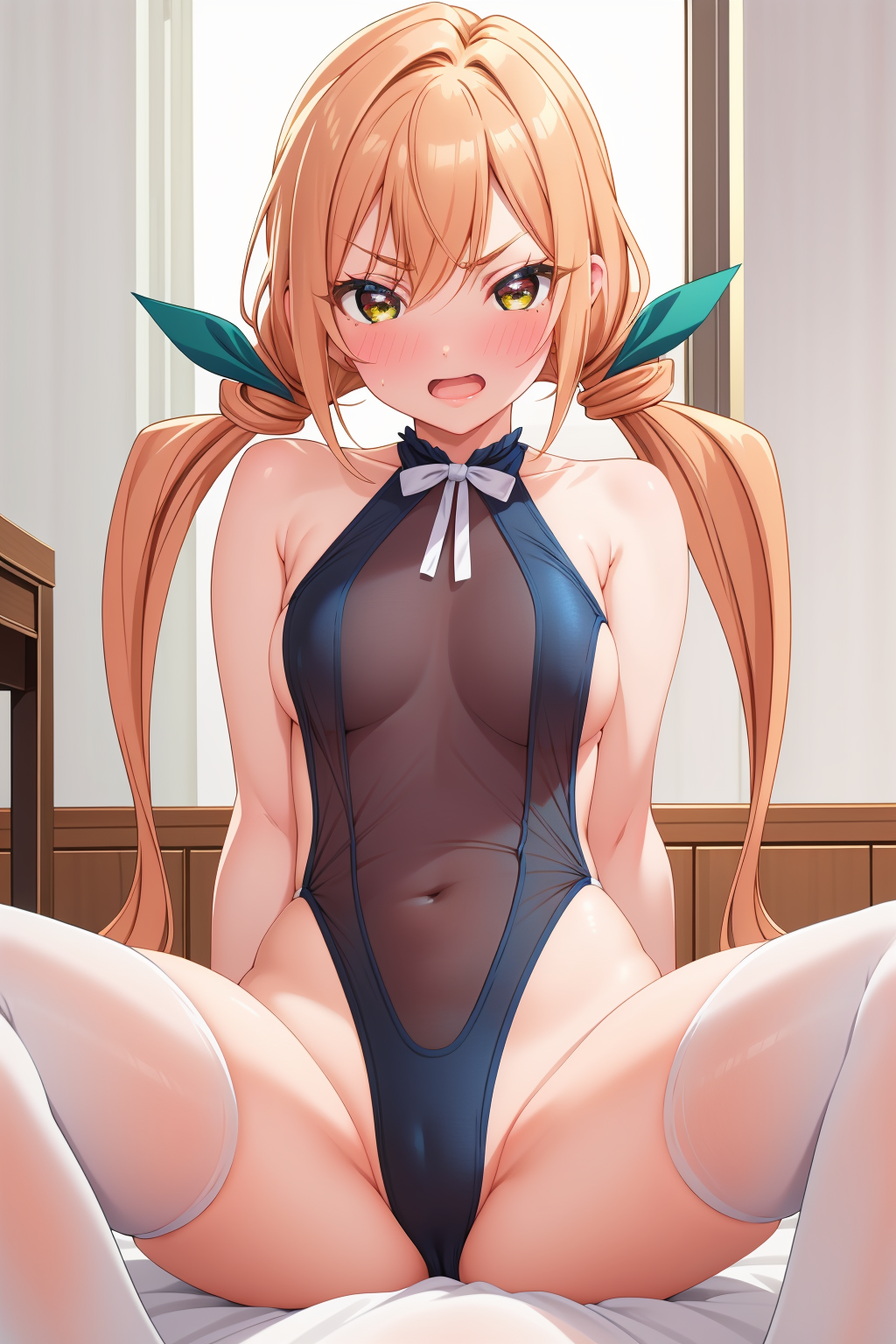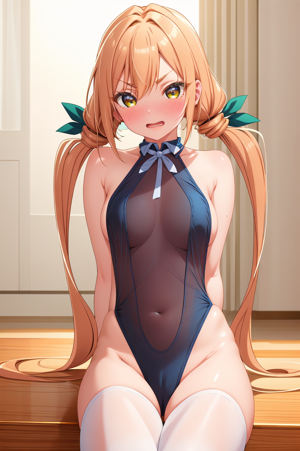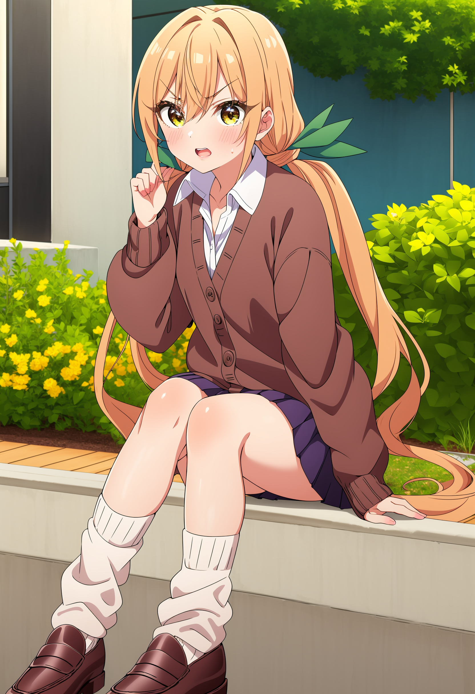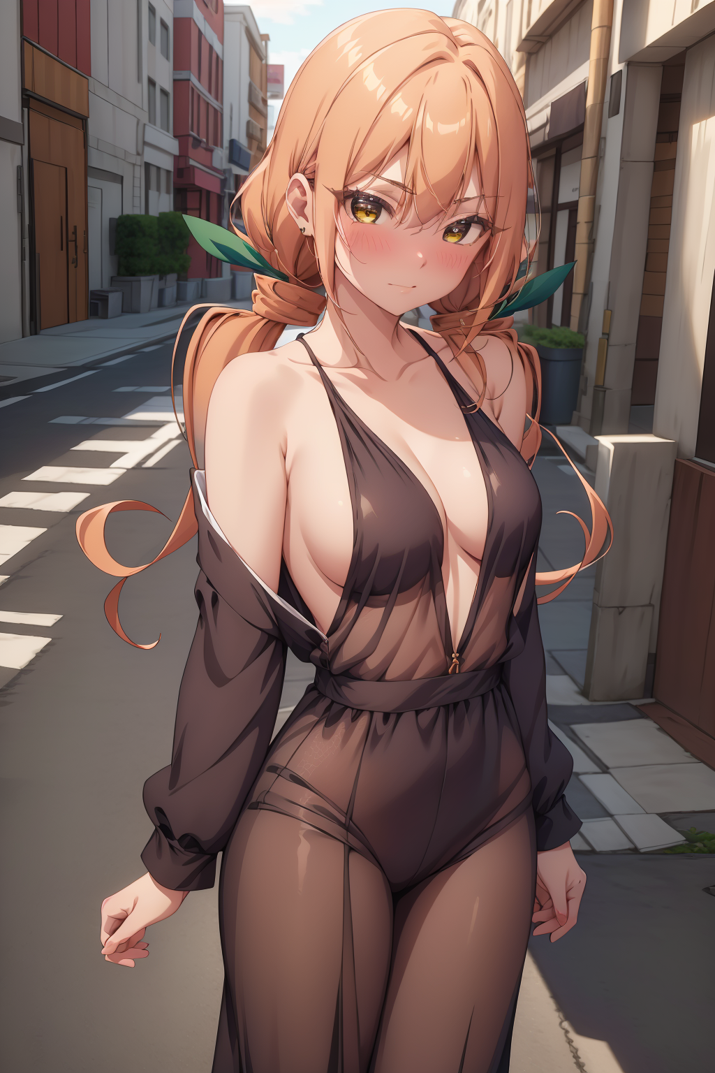 KaraneInda,1girl,solo,low twintails,long hair,blonde hair,orange hair,bangs,green hair bow ribbon,hair between eyes,yellow eyes,