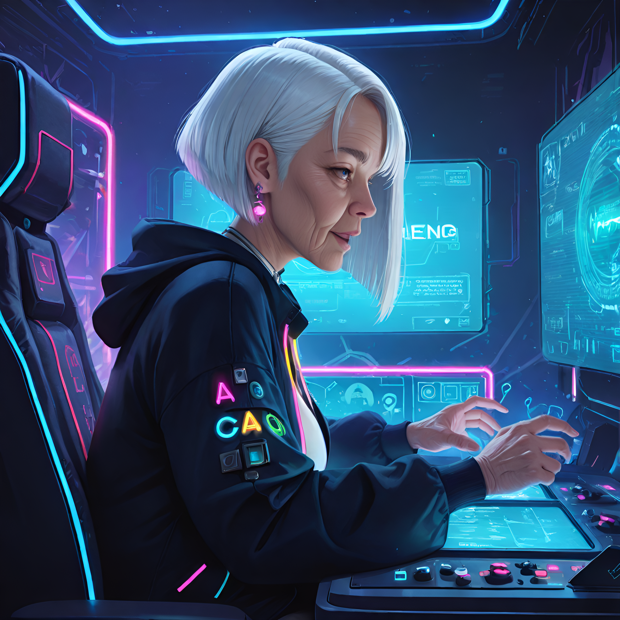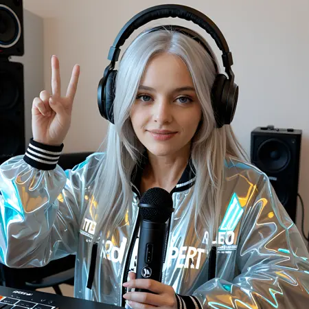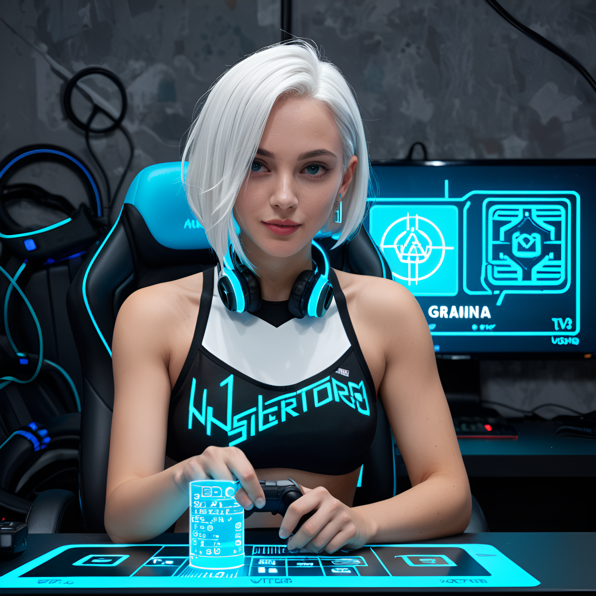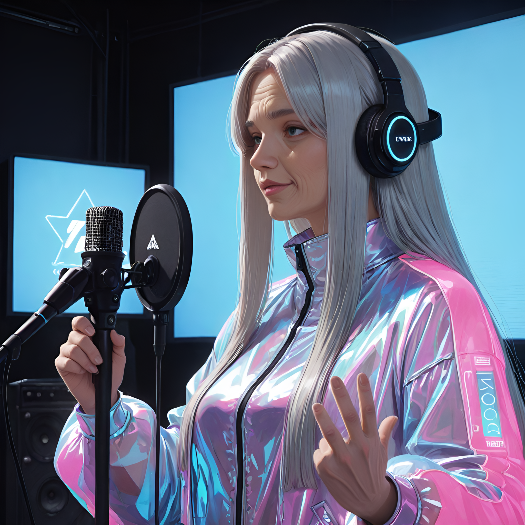 生成你自己的数字偶像——一位被霓虹灯照亮、由全息影像环绕、充满直播能量的流畅V-tuber女孩 ⚡